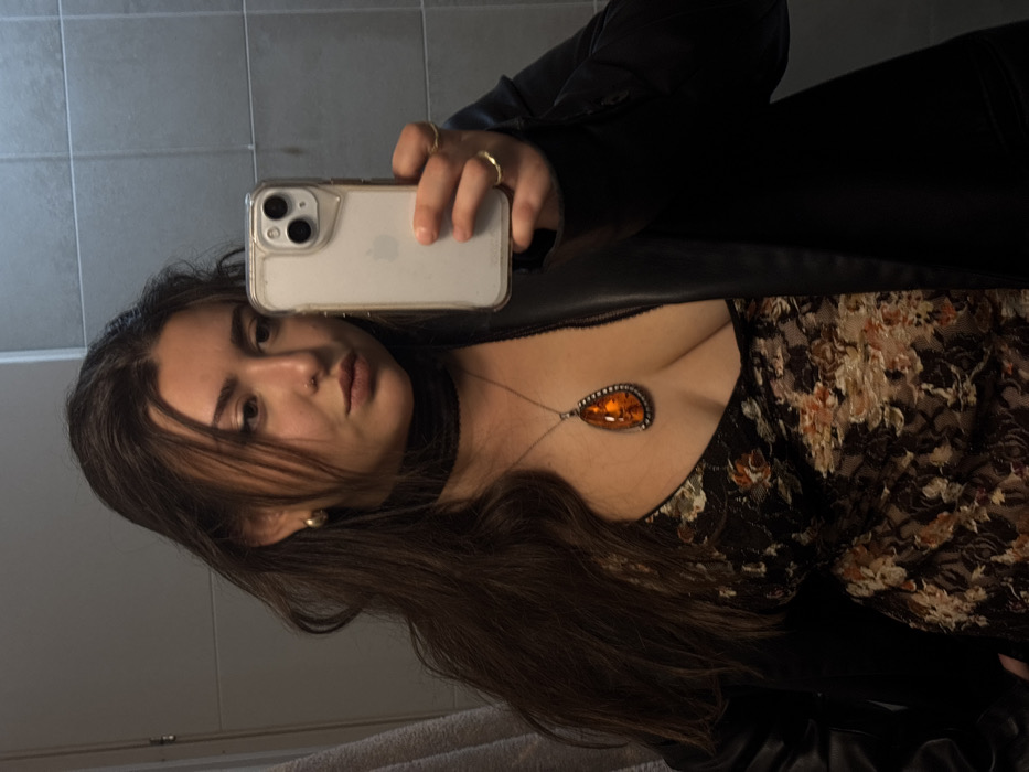 A young woman poses for a selfie in a bathroom with tile walls. She holds her iPhone up, showcasing her face, dark hair, and wardrobe. She wears a black leather jacket over a floral lace top, a black choker, and an amber pendant necklace. She is wearing two gold rings. Her expression is relaxed and direct.