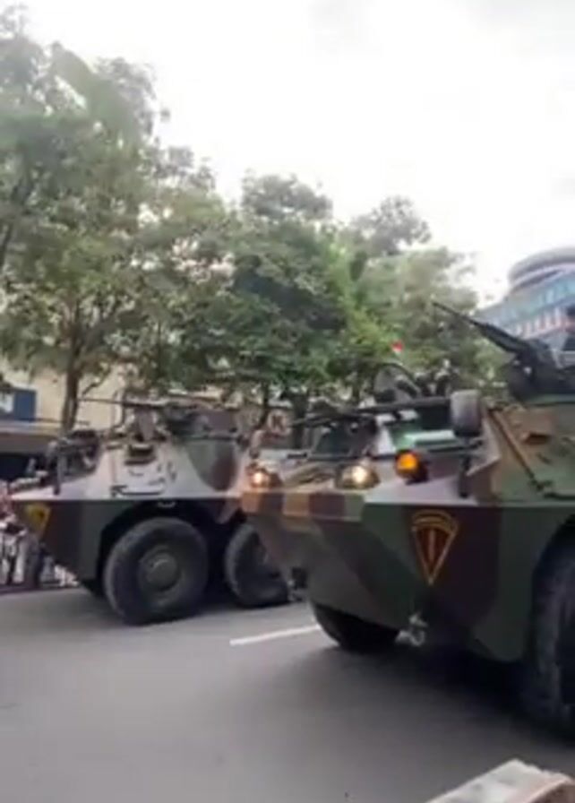 two Condor APCs in camouflage driving on a road with trees and a tall building in the background. Soldiers are manning the machine guns on top of the APCs. Pedestrians are observing the passing vehicles. The day is overcast.