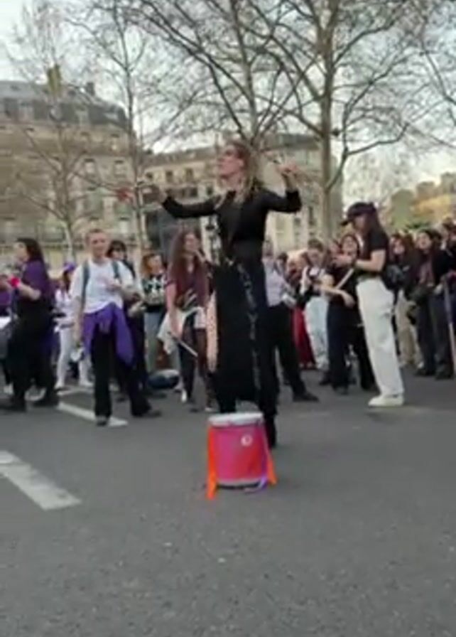 group of women in the street, some playing drums and chanting, with a woman in a black outfit dancing enthusiastically in the center