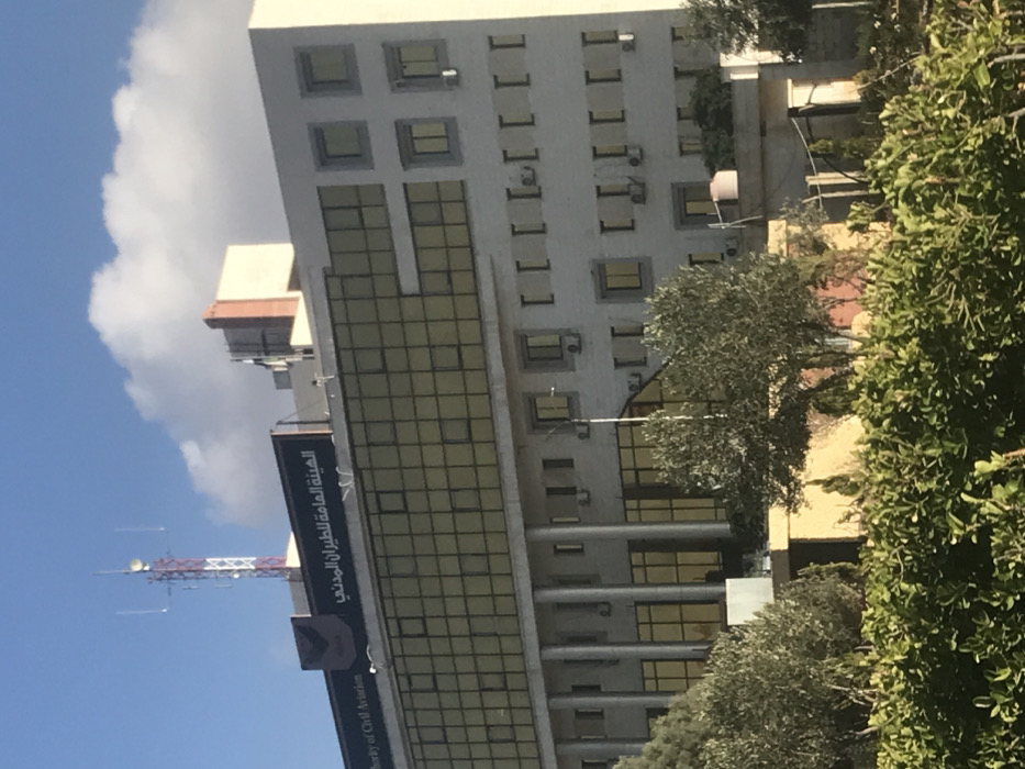 An outdoor, eye-level photograph captures a multi-story, white building with modern architectural elements under a partially cloudy blue sky in Shab'a, Syria. The building's upper facade features a prominent section of golden-tinted, reflective glass windows arranged in a grid pattern. Below this, a series of light-colored columns supports an upper structure. The right side of the building displays rows of smaller, square windows, many accompanied by wall-mounted air conditioning units. On the rooftop, a dark sign with "الهيئة العامة للطيران المدني" (General Authority of Civil Aviation) in white Arabic text is visible, with a partial English translation "Authority of Civil Aviation" on the left. A red and white telecommunications tower with multiple antennas rises from the roof, slightly left of center. The foreground is filled with dense green foliage, including bushes and several olive trees. A light-brown, low-rise structure is partially visible behind the vegetation, along with a light-colored water tank on a rooftop in the lower right. No individuals are present. The scene is brightly illuminated by natural light.