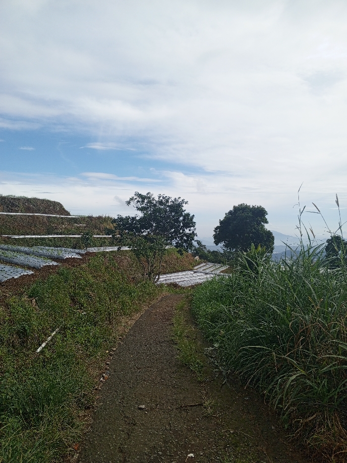 A dirt path cuts through lush greenery leading towards a terraced landscape. Agricultural plots covered in plastic sheeting line the hillside, punctuated by scattered trees. The sky, a mix of blue and clouds, suggests a bright day. The scene evokes a rural, elevated setting, potentially a farmland nestled in a mountainous region. Tall grass and vegetation flank the path, adding to the natural ambiance.