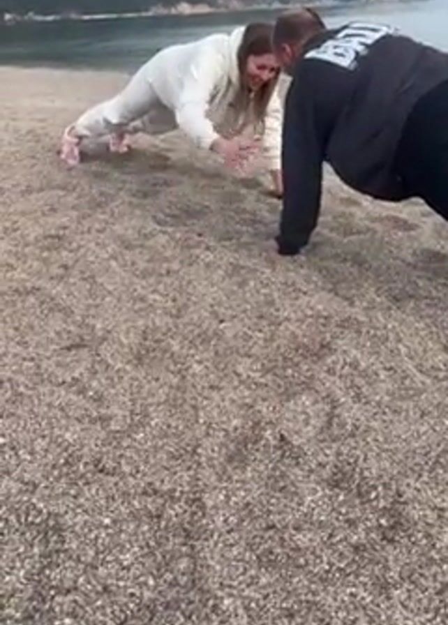Two people, one female and one male, are doing push-ups on a gray pebble beach. The woman is wearing a white tracksuit and pink shoes. The man is wearing a black long-sleeved shirt and black pants. The woman is smiling. In the background is a body of water, and behind that are large, green mountains.