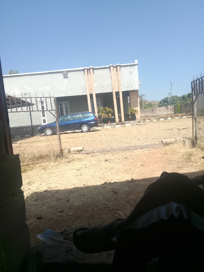 A daytime exterior scene captures a dusty, unpaved yard or driveway on an unidentified property within an unknown city. In the foreground, the silhouette of a person's legs and feet, wearing a dark sandal on the right foot, is visible in shadow, positioned with a white garment or fabric on their lap. A silver-colored shovel head rests on the dirt to the lower left. A chain-link fence runs across the mid-ground, partially obscuring a light grey building with a flat roofline and several light-brown vertical facade elements. A blue station wagon is parked facing left on the dirt in front of the building, which features white-framed windows and doors, and two potted plants near its entrance. Low concrete barriers delineate parts of the unpaved area. In the background, a brown wall or fence is visible, along with sparse trees and a utility pole under a clear, bright blue sky.