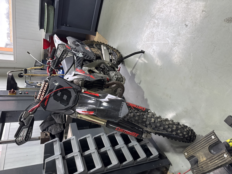 This image depicts a black and red motocross dirt bike parked inside a workshop or garage located in Gabrovo, Bulgaria