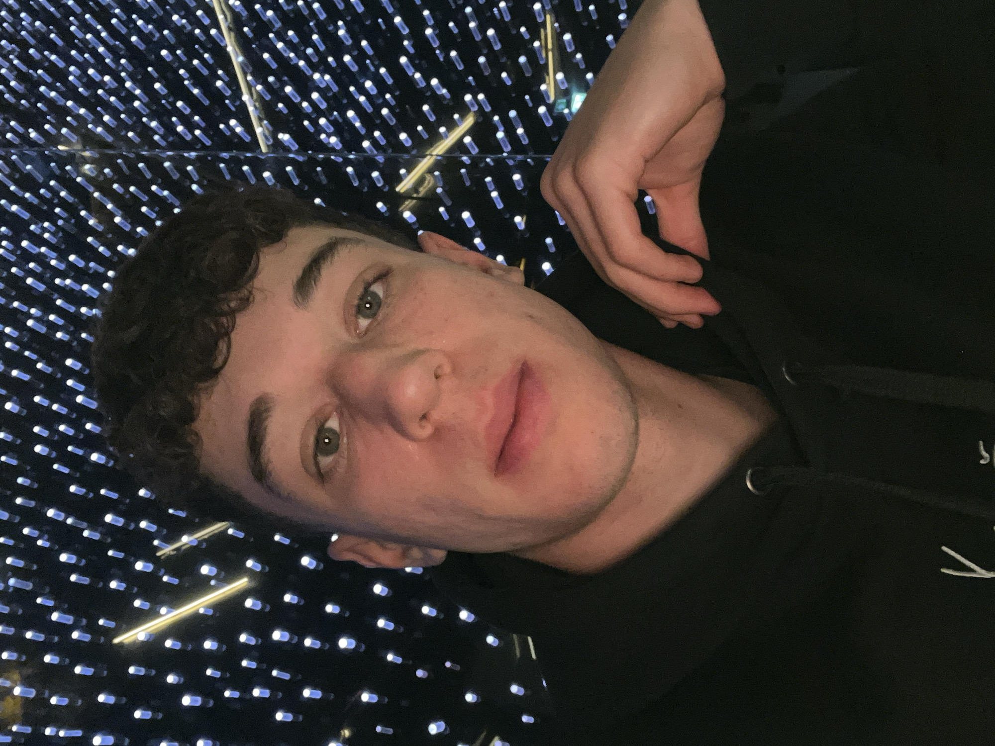 A young man with curly brown hair and light skin is lying down, looking directly at the camera. He is wearing a black hooded sweatshirt. His right hand is raised slightly near his chest. The background appears to be a mirrored surface illuminated by numerous small, closely spaced white lights with golden light tubes creating linear accents. This suggests a contemporary art installation known as "Luci d'Artista" in Turin, Italy.