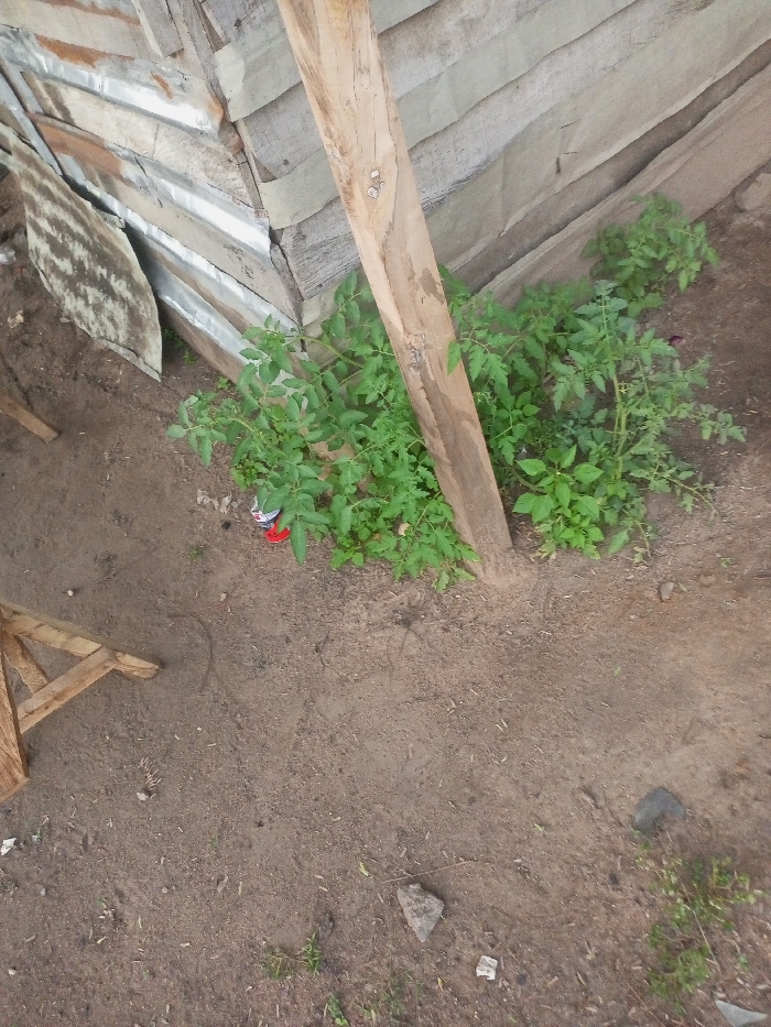 This image depicts an outdoor scene in Zango-ndaji, Nigeria. The foreground shows an expanse of dry, reddish-brown dirt ground with scattered small rocks and debris. In the mid-ground, a cluster of green leafy plants, consistent with young tomato plants, grows directly from the dirt. Partially obscured by these plants, a red and white can is visible. To the right of the plants, a rough-hewn wooden post stands upright, appearing to lean against or support a wall. This wall, positioned diagonally from the upper left to the upper right, is constructed from a combination of weathered wooden planks and sections of corrugated metal, some of which are partially covered with what appears to be woven fabric or sacking material. In the bottom-left corner, a portion of a simple wooden structure, possibly part of a stool or small table, is visible on the dirt ground. No people are present, and no actions or interactions are depicted.