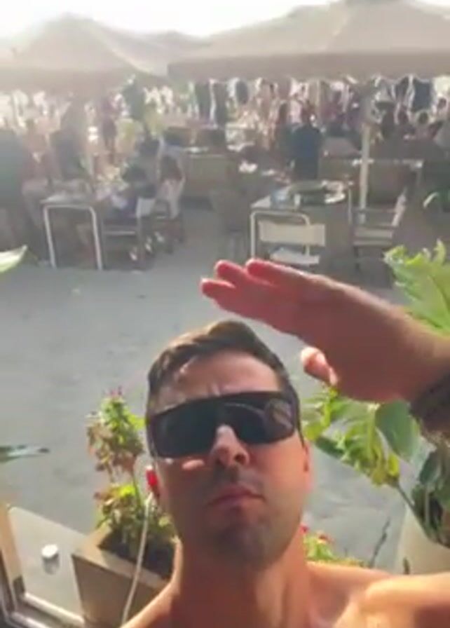 shirtless man wearing sunglasses indoors with a crowded outdoor patio in the background. He raises his hand in front of his face as if shielding himself from the sun. There are tables, chairs, and people visible on the patio. Plants are in pots next to the man, and a window frame is partially visible on the left. The light is bright, making the outdoor scene appear somewhat overexposed. The man looks directly at the camera.