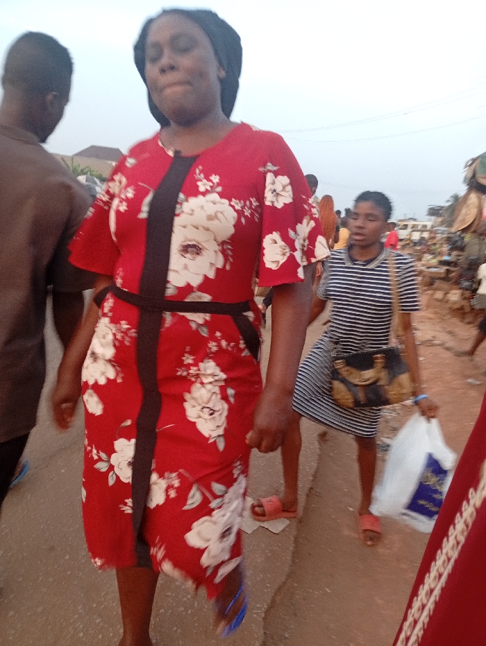 A woman in a red floral dress with a black stripe and belt walks toward the viewer. Behind her, another woman wearing a striped dress and carrying a shopping bag follows. They are on a street bustling with people and stalls. The first woman is centered, with the second woman to her right. The background shows a busy outdoor market scene with various vendors and pedestrians. The overall scene depicts everyday life.