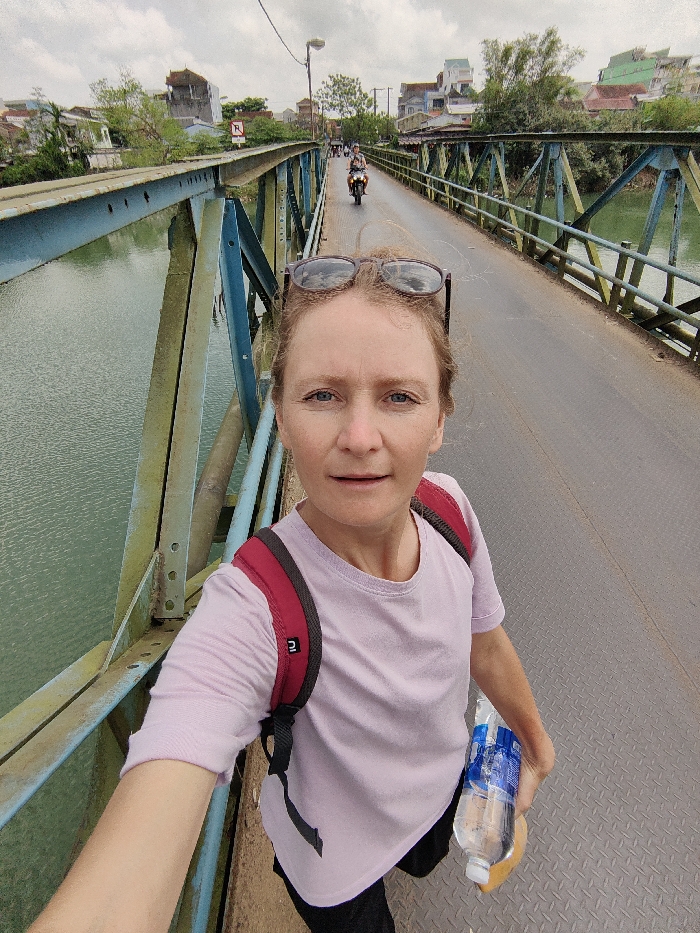 The image depicts a female subject capturing a selfie on a metal truss bridge in Vỹ Dạ Ward, Vietnam, under an overcast sky