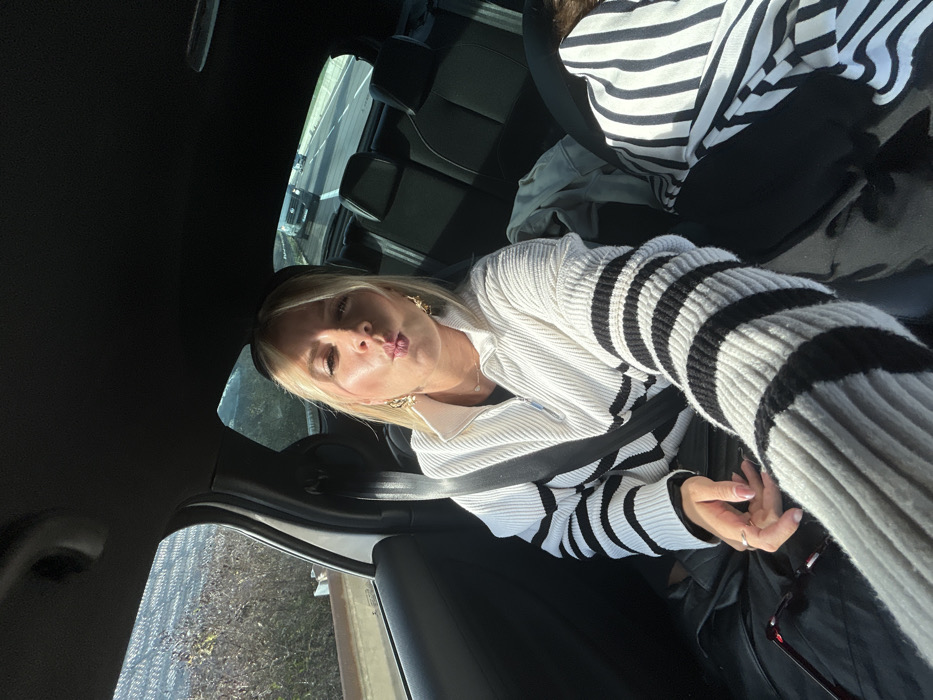 A blonde female is seated in the front passenger seat of a vehicle, wearing a white ribbed long-sleeved top with black horizontal stripes on the sleeves and torso