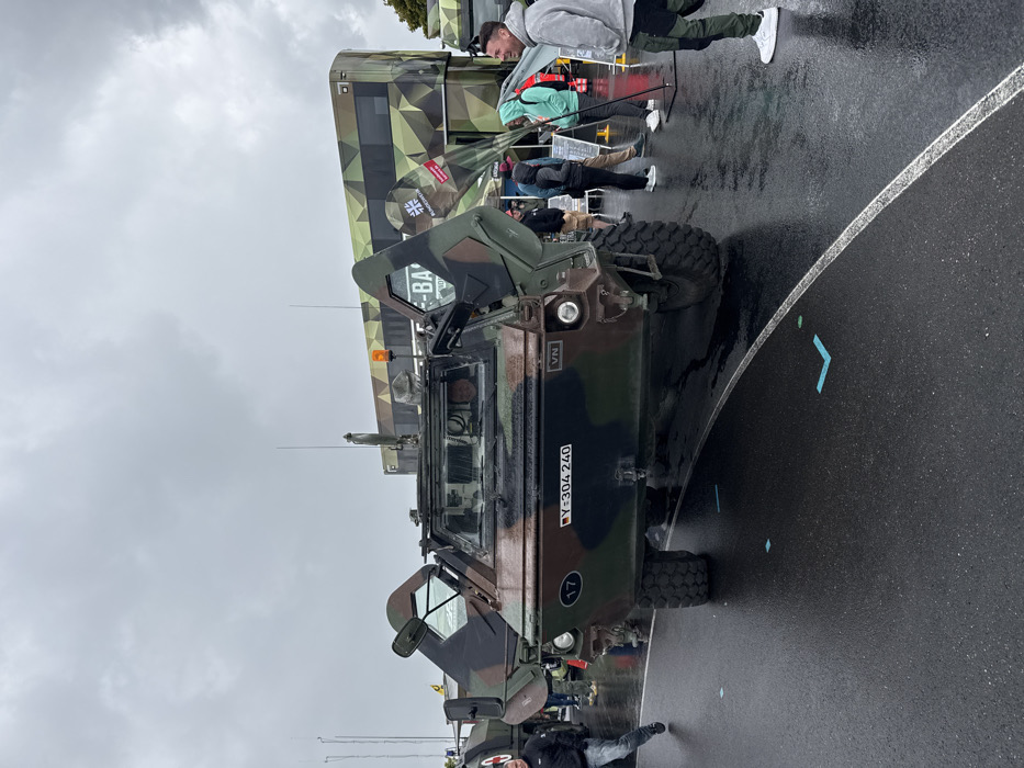 This image captures an outdoor event in Oberlungwitz, Germany, under an overcast sky. The ground consists of wet, dark asphalt or pavement. The central subject is a Bundeswehr (German Armed Forces) armored reconnaissance vehicle, likely a Spähpanzer Luchs, painted in a NATO camouflage pattern of greens, browns, and black. Its front displays the Bundeswehr license plate "Y-304 240." A circular "17" marking is on the front left, and "VN" is on the front right. The vehicle's two front hatches are open, extended upwards and outwards. An adult male with light skin and short hair is visible through the driver's side opening, looking towards the viewer. A yellow/orange warning light is affixed to the vehicle's roof, slightly to the right of center. The front tires are large, knobby, and appear suitable for off-road use. Blue L-shaped and dot markers, along with a partial white curved line, are present on the wet pavement in the immediate foreground. Approximately seven to ten individuals are visible in the scene. On the far left, a person in dark attire is walking away, partially obscured. To the right of the central vehicle, an adult male with light skin, dark hair, and a beard, wearing a grey hooded sweatshirt, dark cargo pants, and white sneakers, stands smiling and looking towards the vehicle. Another individual in a light blue/teal hooded jacket stands further back near a display. Other people are standing or moving in the background, generally clustered near the display structures. In the background, on the left, a portion of another military vehicle, possibly an ambulance (indicated by a red cross on a white circle), is visible, along with a tall metal antenna mast. To the right, a large, rectangular, multi-sectioned structure, covered in a geometric camouflage pattern, serves as a backdrop. Adjacent to this structure, two banners are displayed: one with the German flag and "BUNDESWEHR" text, and another with a red background. The wet ground surface suggests recent rain.