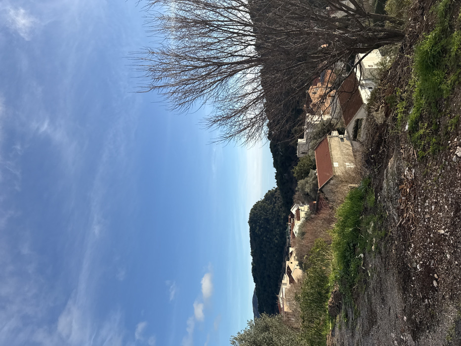 A photograph depicts an elevated view of Petrovac na Moru, Montenegro, under a clear blue sky. The foreground comprises an unpaved, earthy slope with sparse green grass, scattered small rocks, and wood debris, including twigs. A large, bare deciduous tree with multiple dark branches occupies the right foreground, extending upwards and partially out of frame. To the far left, a portion of an olive tree with green foliage is visible. The midground showcases a residential area consisting of multiple light-colored buildings, predominantly white, beige, and light grey, featuring terracotta-tiled roofs. Several structures exhibit external air conditioning units attached to their facades. Interspersed among the buildings are various evergreen bushes and smaller trees. In the background, densely forested green hills rise, with their undulating contours visible. Beyond these hills, a narrow, lighter blue band on the horizon indicates the presence of the Adriatic Sea. The sky is largely clear and bright blue, featuring minimal white cirrus clouds stretching horizontally across the upper portion and a few small cumulus clouds near the horizon on the left. No individuals, animals, or vehicles are present in the scene.