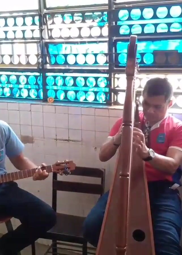 A group of three people are indoors. A young man sits on a chair to the left and plays a tan colored guitar. In the center, a man in a red collared shirt also sits and plays a large dark brown harp. A second young man is on the right, wearing a blue collared shirt and dark pants, and stands next to a chessboard on a table. A white board is on the left, and a window with blue glass tiles is behind the musicians. The room has white tile walls. The scene is lit with natural light.