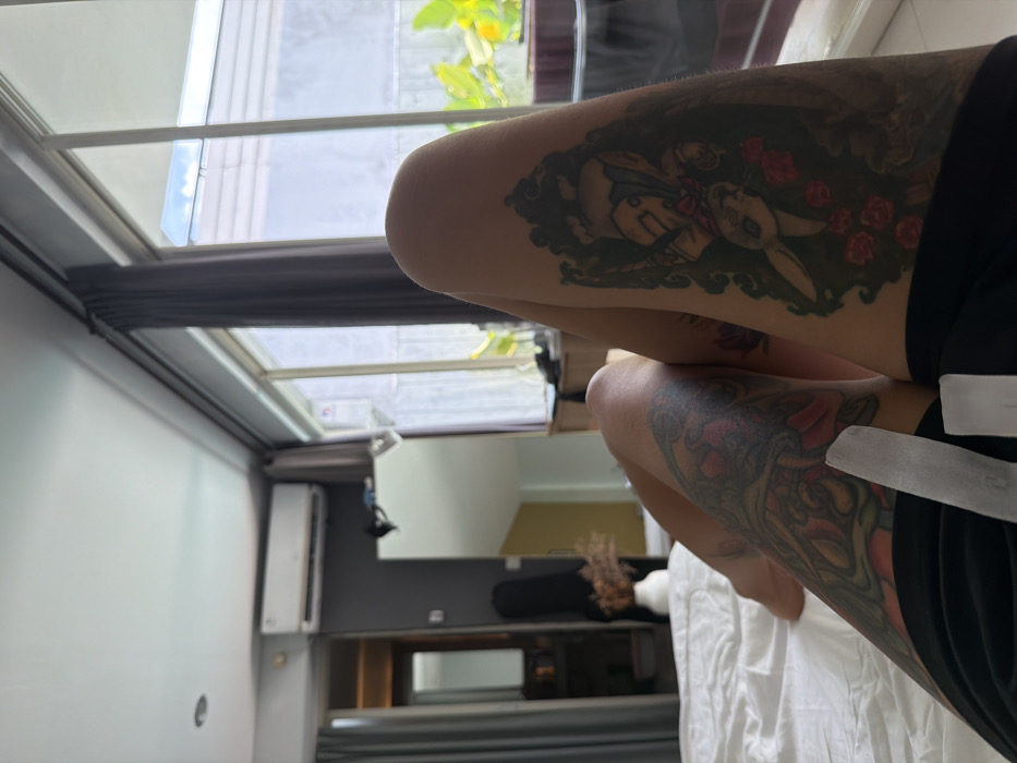 A person sits with crossed legs, revealing intricate tattoos on both thighs. The left thigh features a tattoo of a rabbit figure surrounded by roses. The right thigh displays a colorful, ornate tattoo. The individual wears black shorts. In the background, a window with blinds reveals glimpses of green foliage. A minimalist room with white walls and a gray accent wall is partially visible. A bed with white sheets sits nearby.