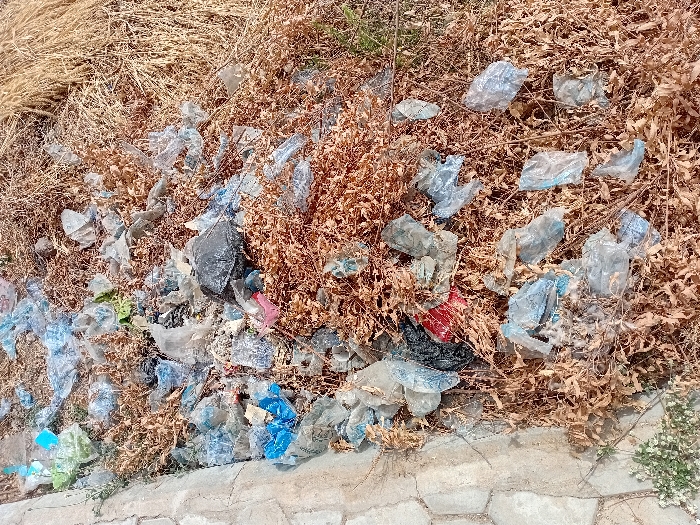 The image displays an outdoor ground-level scene in Kwazailewa, Nigeria, characterized by a substantial accumulation of refuse. The primary ground cover consists of a dense layer of dry, light brown vegetative debris, including brittle leaves, twigs, and dead plant matter. Interspersed and partially obscured within this vegetation are numerous discarded plastic items, predominantly crumpled plastic bags in various states of degradation. These plastics exhibit colors such as translucent blue, clear/white, black, red, and green. A larger, dark plastic object is visible near the center. To the left of the frame, a segment of light-colored paving, likely concrete or stone pavers, forms a distinct linear boundary, with a small amount of green foliage at its base. The right side of the frame features taller, dry, straw-like grasses. No individuals, animals, or active events are present in the static scene.