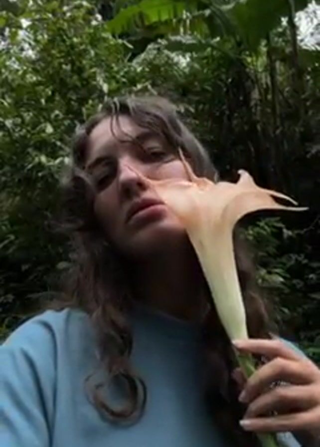 A young woman with curly brown hair stands outdoors amidst lush greenery, holding a large, trumpet-shaped flower near her face