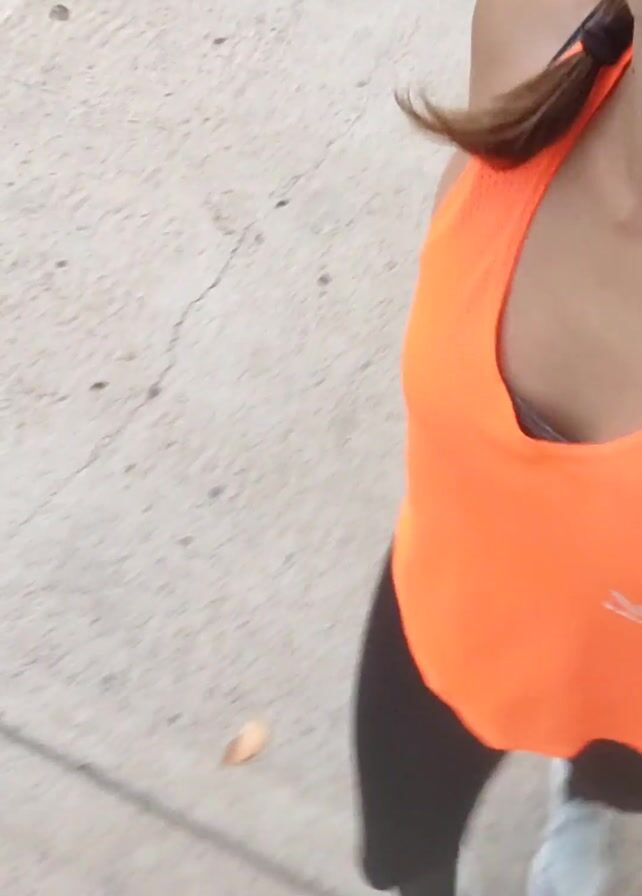 A woman with brown hair pulled back in a ponytail is recording a selfie video while walking outside. She is wearing an orange athletic tank top with a white logo on the front. The camera is close to her face and the background shifts as she moves. Early in the video, another runner passes her in the distance. As the video progresses, the background changes from concrete sidewalks and buildings to trees with dense foliage. At the end of the video, the camera is very close to her face, obscuring much of the background.