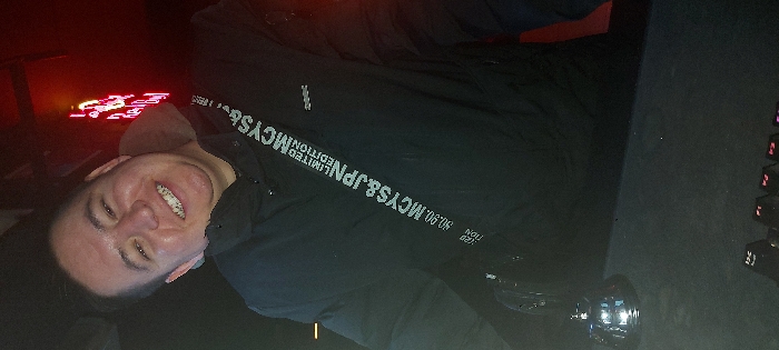 An adult male is depicted in a medium-shot portrait within a low-light indoor setting in Tashkent, Uzbekistan. He presents with a smiling facial expression, revealing dental braces on his upper teeth, and looks directly towards the camera. He wears a dark, possibly black, padded jacket. A black fabric strap with white text reading "90.90.MCYS&JPN LIMITED EDITION" runs diagonally across his chest. A small, dark rectangular logo is visible on the upper right chest of the jacket. The background features blurred red neon lighting, including a partially visible stylized bull or "Red Bull" logo. In the lower left foreground, a reflective, bell-shaped object is present. The immediate foreground includes a dark surface displaying several illuminated keys or buttons, consistent with an electronic control panel or mixing console, marked with labels such as "12C," "V1," "V2," and "V3."