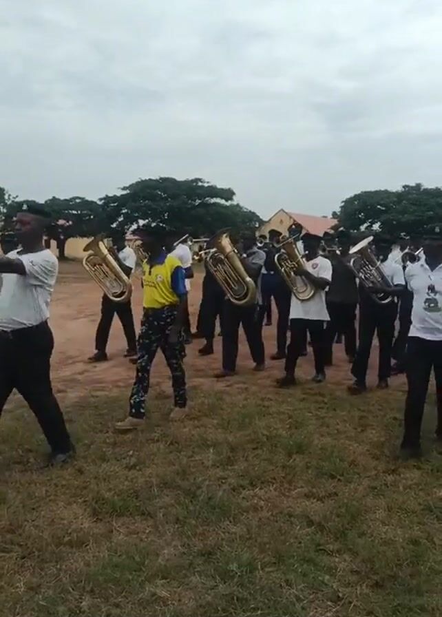 A group of young men, mostly dressed in white shirts and black pants, are marching in formation across a grassy field. They are playing brass instruments, primarily tubas, and a trombone. One man wears a yellow shirt. Another man is marching alongside the band, holding a clipboard and wearing a black beret. In the background are trees and a low building. The sky is overcast.