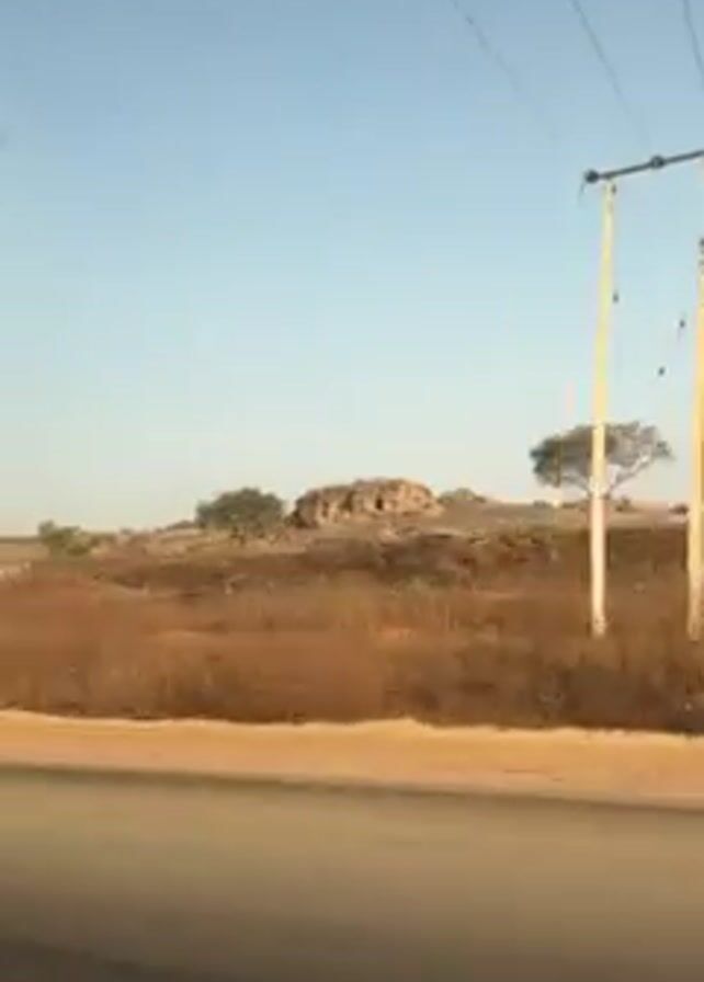 view from a moving vehicle driving on a road. The sky is clear and light blue. To the side of the road, there is dry, brown vegetation. Initially, utility poles with wires are visible. As the vehicle moves, buildings with red roofs and white walls appear. The buildings seem to be of a similar design and have fenced-in areas. A tall communication tower is seen behind one of the buildings. The video ends with a view of these buildings with red roofs.