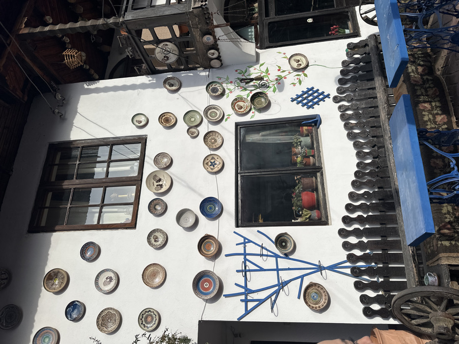 The image depicts an exterior view of a building facade in Horezu, Romania, adorned extensively with traditional pottery. The primary wall is painted white, featuring numerous ceramic plates of various sizes and designs, hung directly on the surface. These plates display motifs such as roosters, geometric patterns, and floral elements in colors including blue, brown, green, and white. An upper rectangular window with a dark brown frame and multiple panes is present on the white wall. Below it, a lower horizontal window with a black frame shows several potted plants on its interior windowsill. To the far right, a dark-framed door is partially visible, also revealing potted plants inside. An ornate dark wooden structure, possibly a balcony or an upper floor extension, projects from the upper right, similarly decorated with ceramic plates and a hanging wooden object. On the lower left wall, a stylized blue metal or painted tree-like structure with circular metal holders is affixed, with one ceramic plate hanging within it. To the right of the lower window, a green vine with red accents is painted directly on the wall, incorporating several plates into its design, alongside a small blue lattice pattern. In the foreground, an outdoor seating area is visible. A dark wooden bench or fence with a scalloped top runs horizontally across the middle. In front of this, two tables are present, each featuring a blue-painted rectangular top supported by ornate cast-iron bases, characteristic of repurposed sewing machines. The ground beneath the tables is covered with a patterned material displaying floral designs. On the far left, a large wooden wagon wheel stands vertically, next to a terracotta pot. A small patterned cup or pot rests on the patterned ground covering near the wagon wheel. A person is partially visible on the far left edge of the frame, showing only the side profile of their head, facing right. The scene is illuminated by bright sunlight, casting distinct shadows of the plates and structures onto the white wall.