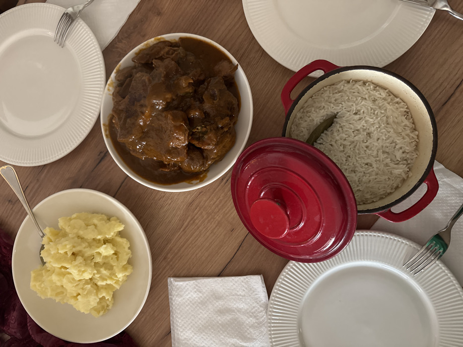 The image displays a meal laid out on a light brown wooden table, located in the city of Anavissos Municipal Unit, Greece. No people are visible. In the upper left quadrant, a white bowl contains a serving of light yellow mashed potatoes, with a silver spoon partially submerged within. Adjacent to the upper right edge of this bowl, a dark red fabric is partially visible. Centered on the right side, a larger white bowl holds a quantity of dark brown stew consisting of meat pieces immersed in a reddish-brown sauce. Below the stew, positioned in the lower center, a small red cast-iron pot with handles is open, revealing white rice inside. A single green pod rests on the surface of the rice. The matching red lid for this pot is placed askew on its rim. Two empty white dinner plates with ribbed edges are part of the setting: one is in the upper right, accompanied by a silver fork, and the other is in the lower left, accompanied by a silver fork with a green handle. A folded white paper napkin is situated to the left, between the mashed potatoes and the lower-left plate.
