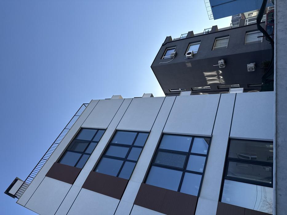 The image depicts a street scene in Varna, Bulgaria, showcasing two multi-story buildings under a clear blue sky. On the left, a modern, white-facade building features numerous large, dark-framed windows reflecting the sky. This building has dark brown vertical accent panels integrated into its exterior, and horizontal dark lines separating its floors. A black metal railing borders its flat rooftop, which also includes a small, rectangular, light-colored structure. To the right and slightly recessed, a dark gray building stands, characterized by several white exterior air conditioning units mounted on its walls. This building displays multiple windows and some balconies with glass railings. Sunlight casts reflective patterns on its dark facade. In the immediate foreground, a low, light-colored wall is visible, with a dark mesh or fabric fence and a partial view of a red vehicle behind it. Further to the right in the background, a section of a blue building is partially visible. No individuals are present in the visible frame.