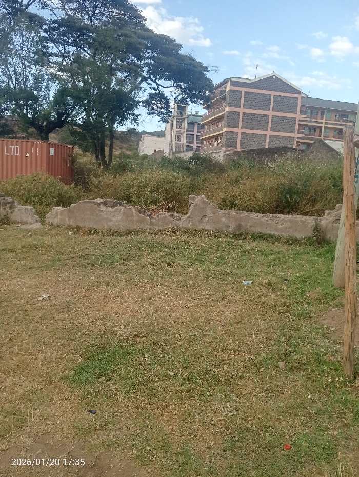 The image depicts an outdoor scene in the City of London ward, Kenya, captured at 17:35 on January 20, 2026. The foreground consists of an unkempt grassy area, predominantly dry and yellowish-brown, with interspersed patches of green vegetation. Scattered on the ground are a small white crumpled object and a red object, possibly a bottle cap. Across the midground, a broken, low-height wall constructed of concrete or stone fragments runs horizontally, separating the foreground from dense, overgrown shrubbery and taller grasses immediately behind it. To the left of the shrubbery, a reddish-brown shipping container, marked with "LTD" on its visible side, is positioned. In the background, several multi-story buildings are visible. A prominent building with dark grey stone block construction and light pink horizontal banding features multiple windows and balconies. Behind and to its left, another lighter-colored, multi-story structure with exposed concrete elements is present. Large, mature trees with dark green foliage are visible to the left, partially obscuring a distant, vegetated hillside. The sky above is bright blue with scattered white clouds. A weathered wooden post stands vertically at the far right edge of the frame. No individuals or active interactions are visible within the scene.