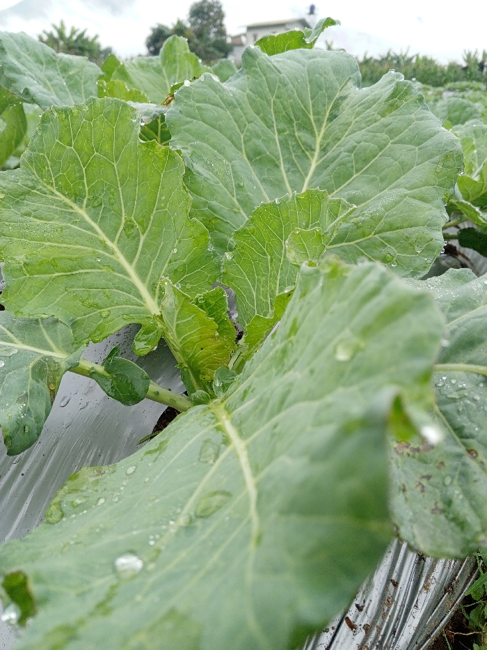 Lush green cabbage plants fill the frame, their broad leaves glistening with water droplets. Veins are prominent on the leaf surfaces. Rows of plants extend into the background, partially obscured by overcast skies. The plants are growing on a plastic-covered bed, with hints of soil peeking through. Some unidentified structure and trees are visible in the distance.