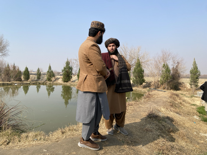 The image portrays two men engaged in conversation on a dry, earthen bank adjacent to a calm body of water, identified as being in Deh Sabzi, Afghanistan