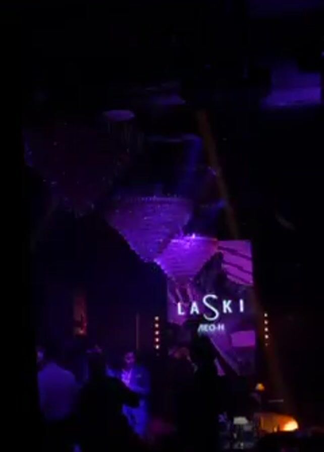 interior of a nightclub with dark lighting. Several chandeliers hang from the ceiling. A brightly lit sign reads "Laski" with text below. Several people are visible, but mostly silhouetted. There are light beams flashing in the club. The people are standing and mingling.