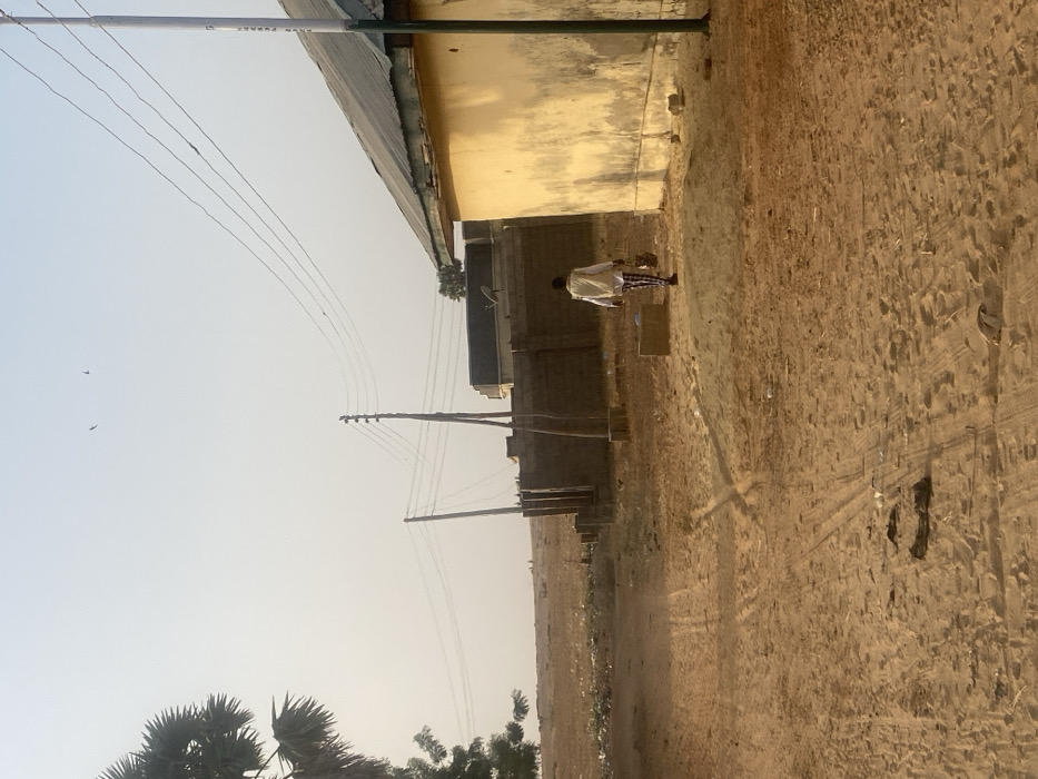 A dusty outdoor scene with a sandy road and a person walking in the distance. Buildings of varied construction line the road, some with yellow facades. Power lines stretch across the sky, supported by utility poles. The sky is hazy, suggesting either an early morning or late afternoon light. Sparse vegetation is visible in the lower part of the image.