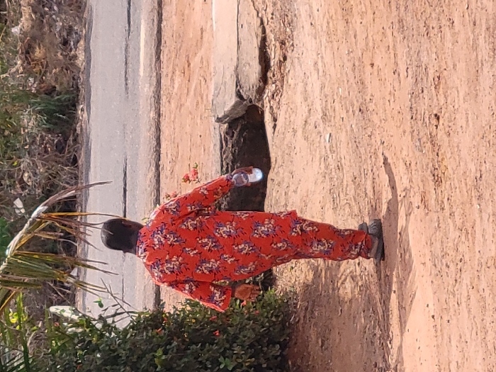 A single individual is depicted walking away from the camera on a dirt path in Ebenebe, Nigeria. The person wears a matching red, orange, and blue floral patterned long-sleeved top and trousers, along with dark sandals. In their right hand, they carry a clear plastic bottle. To the left, dense green foliage is visible. The ground consists of reddish-brown dirt. In the mid-ground, a dark, uneven patch of earth and a grey concrete-like slab are present. In the background, an asphalt road with visible wear extends horizontally. Beyond the road, dry, sparse vegetation is observed. A palm frond extends into the upper left quadrant of the frame. The scene is illuminated by daylight, casting shadows to the right of the individual.