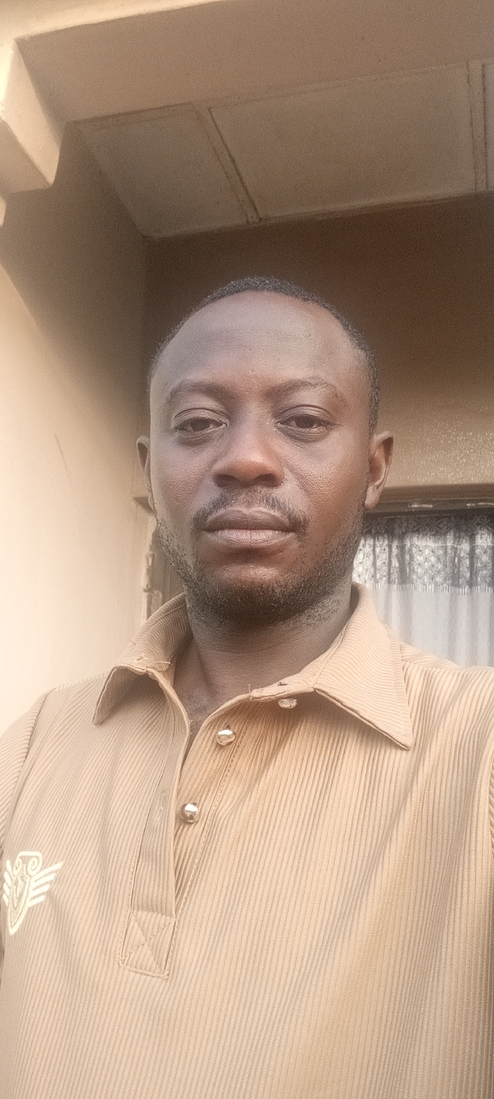 A man with a shaved head and dark complexion is centered in the frame. He sports a neatly trimmed mustache and beard. The man wears a light brown, collared shirt with silver buttons and an emblem visible on the left side. The background shows a beige ceiling and wall, with a window partially obscured by curtains behind him. The lighting is subdued.