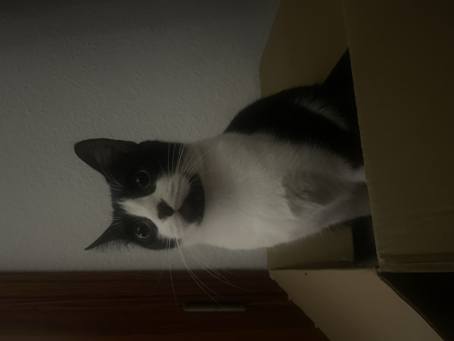 - "A black and white cat peeks from inside a cardboard box, its head tilted downward" by FM-uxU7C3, licensed under CC BY 4.0