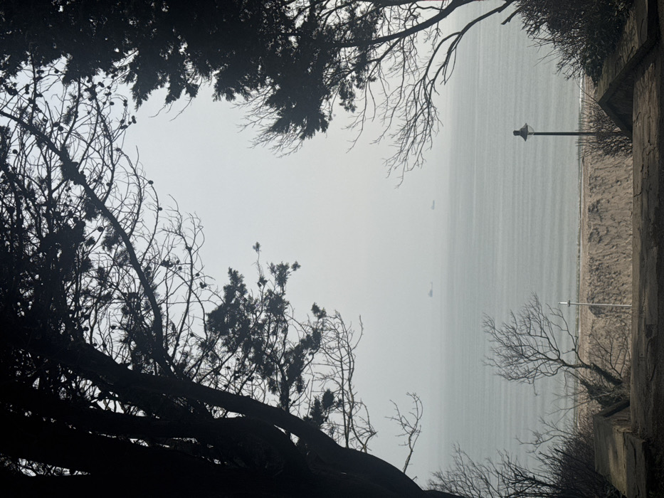 The image presents a hazy coastal panorama in Burgas, Bulgaria, observed from an elevated position. The view is framed by dense, dark silhouettes of evergreen trees, notably conifers displaying numerous pinecones, interspersed with bare deciduous branches. In the immediate foreground, a dark, horizontal concrete or stone structure, possibly a wall or steps, is present. A single black lamppost with an ornate top stands upright on the right side of the mid-foreground. A slender, pale, vertical pole featuring a small horizontal element is situated on the left. Beyond the foreground vegetation and structures, a sandy beach or eroded cliff face transitions into the calm, grey-blue waters of the Black Sea. Three large vessels, appearing as dark, indistinct silhouettes, are visible on the distant horizon line, partially obscured by atmospheric haze. The sky above is uniformly light grey and overcast. No human subjects or discernible activities are present.