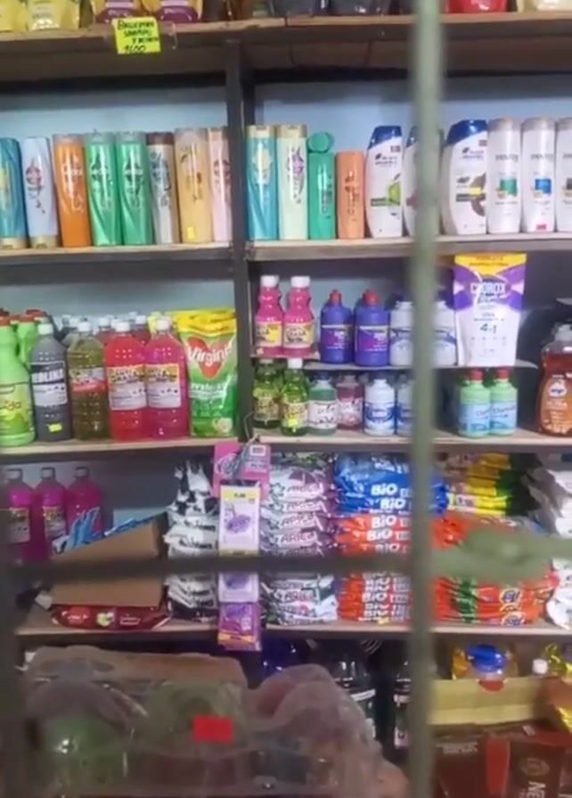 The camera pans up a metal shelving unit stocked with grocery items behind a metal security gate. On the first shelf, starting from the left are packaged spices and seasonings. The next shelf features shampoo and conditioner. The shelf below contains household cleaning supplies. The shelf at the bottom has laundry detergent and cooking oil. A voice speaks, presumably from behind the camera. A pencil comes into view at the right.