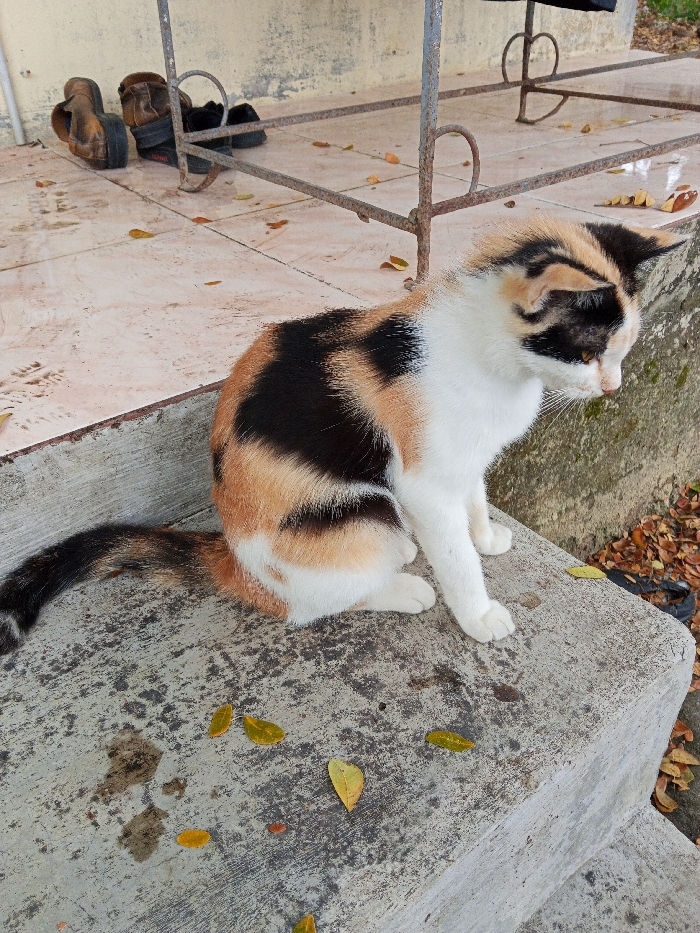 - "A calico cat, exhibiting white fur with distinct patches of black and various shades of brown/orange, is seated on a gray concrete step in Lhokseumawe, Indonesia" by FM-JfXSH2, licensed under CC BY 4.0