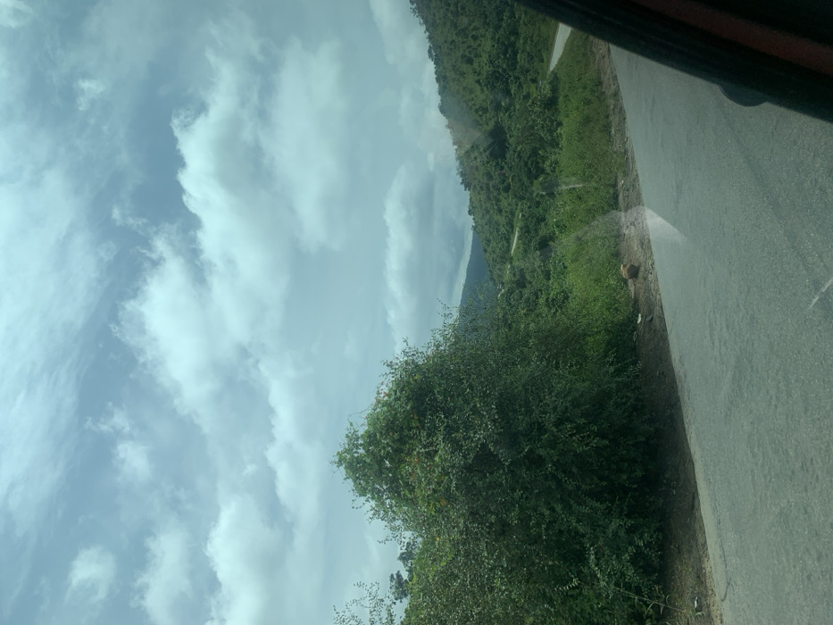 The image depicts a rural mountainous landscape in Assob, Nigeria, viewed from what appears to be a vehicle. The foreground features a two-lane paved road, dark grey in color, running from the lower left to the mid-right, curving into the distance. To the immediate left of the road, a dirt shoulder is visible, on which a small, irregular brown object rests near the center-left. Above this shoulder and extending towards the left is dense, verdant vegetation, dominated by a large, bushy tree with thick green foliage and hints of reddish-orange elements, possibly fruit or flowers. The midground and background consist of multiple layers of heavily forested hills and mountains, uniformly covered in lush green vegetation, suggesting a tropical or subtropical environment. A winding segment of the same road is visible on the hillside in the mid-right. The sky overhead is partially overcast with numerous light blue and white cumulus clouds. Reflections from an interior element are visible on the far right side of the image, indicating the perspective is from inside a vehicle. No human figures or discernible animal life are present.