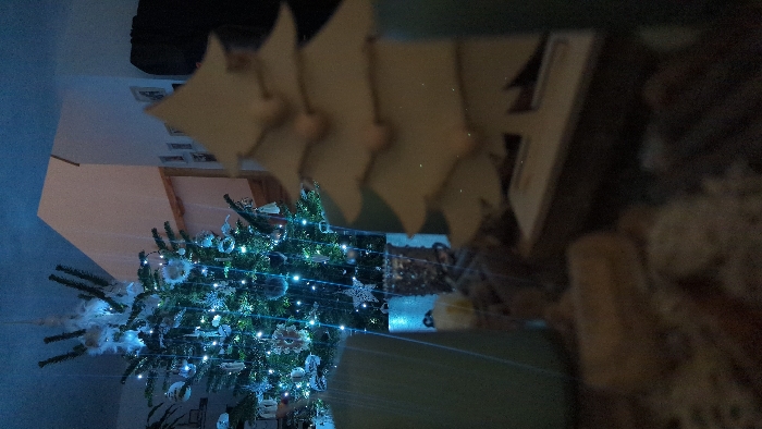 A decorated Christmas tree is seen indoors, adorned with lights and various ornaments. A wooden Christmas tree stands nearby, and a blurred photograph of people sits to the right of the wooden tree. The wall has a light blue hue.