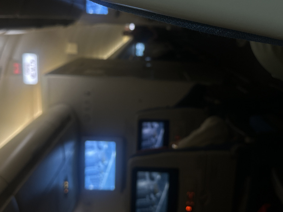 The interior of an airplane cabin is seen in soft focus. Seats with small screens on the back face forward. A window shows a bright blue sky. A glowing sign is on the wall near a cabin light. A dark, fuzzy object is in the foreground, likely a part of the seat or overhead compartment. The image is dimly lit, creating a sense of ambiance.