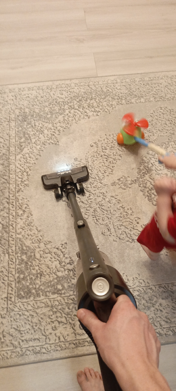 An overhead-angle photograph depicts an indoor scene in Марковский, Russia. A light-skinned adult's right hand is visible in the lower right foreground, gripping the handle of a dark-grey cordless stick vacuum cleaner. The vacuum's elongated body extends towards the center-left. The vacuum head, branded "Doffler" and featuring a single illuminated LED light, rests on a light-grey textured rug with an abstract patterned design. A cleaned strip of rug is visible directly behind the active vacuum head. To the lower left, a bare adult left foot is partially visible on a light-colored wooden floor, which transitions into the rug. In the upper right midground, a child's left hand, partially obscured, holds a toy with a rapidly spinning red propeller, a green body, and orange wheels. The child's lower right leg, dressed in a red garment, is visible near the toy. The vacuum cleaner appears to be in operation.