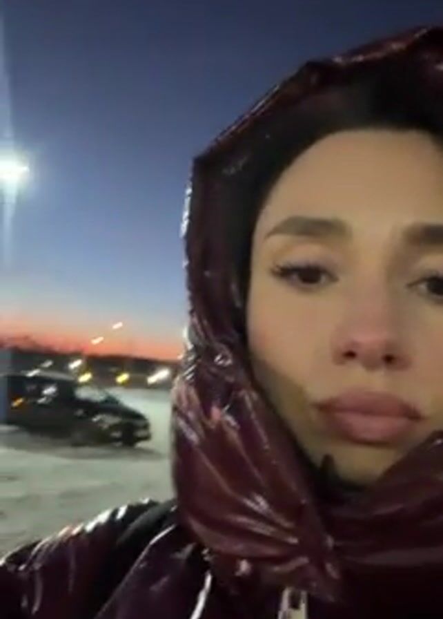 The video features a woman wearing a shiny, burgundy puffer jacket with the hood up. She is looking directly at the camera. Her expression is serious, and she appears to be outdoors in what looks like a parking lot or open area. The sky is dark with the horizon lit with the orange glow of sunset or sunrise. There are cars parked in the background and streetlights are visible. Snow covers parts of the ground. The woman is the main focus, and the camera remains steady on her face.
