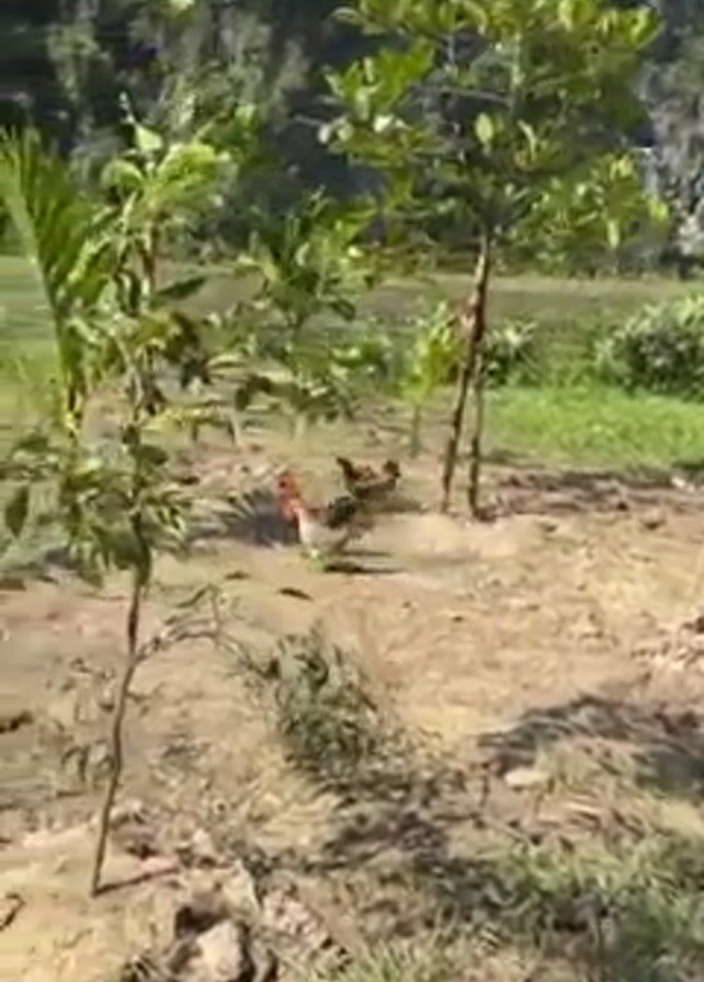 n outdoor scene with a group of chickens in a rural setting. The chickens are of various colors and sizes, mostly roosters. They are moving around on a patch of dirt and sparse grass, with several small trees and plants scattered throughout the area. In the background, there is a large, rocky cliff covered in green vegetation, suggesting a mountainous or hilly environment. The sky is bright, indicating it is likely daytime. The camera pans slightly, following the movement of the chickens.