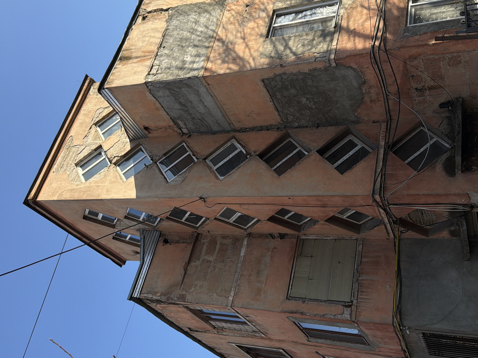 The image displays a multi-story building located in Yerevan, Armenia, under a clear blue sky. The building features an aged, rough peach-orange stucco exterior with visible deterioration, including cracked plaster and sections of exposed concrete or grey patching. The most distinctive architectural feature is a series of modern, white-framed windows installed diagonally, forming a diamond pattern along the prominent corner and extending onto the adjacent facades. Other windows on the leftmost visible facade are conventionally oriented horizontally. Black electrical and communication wires are strung across the foreground, obscuring parts of the building. Sunlight casts shadows from an off-camera tree onto the right side of the structure. No individuals are present in the scene.