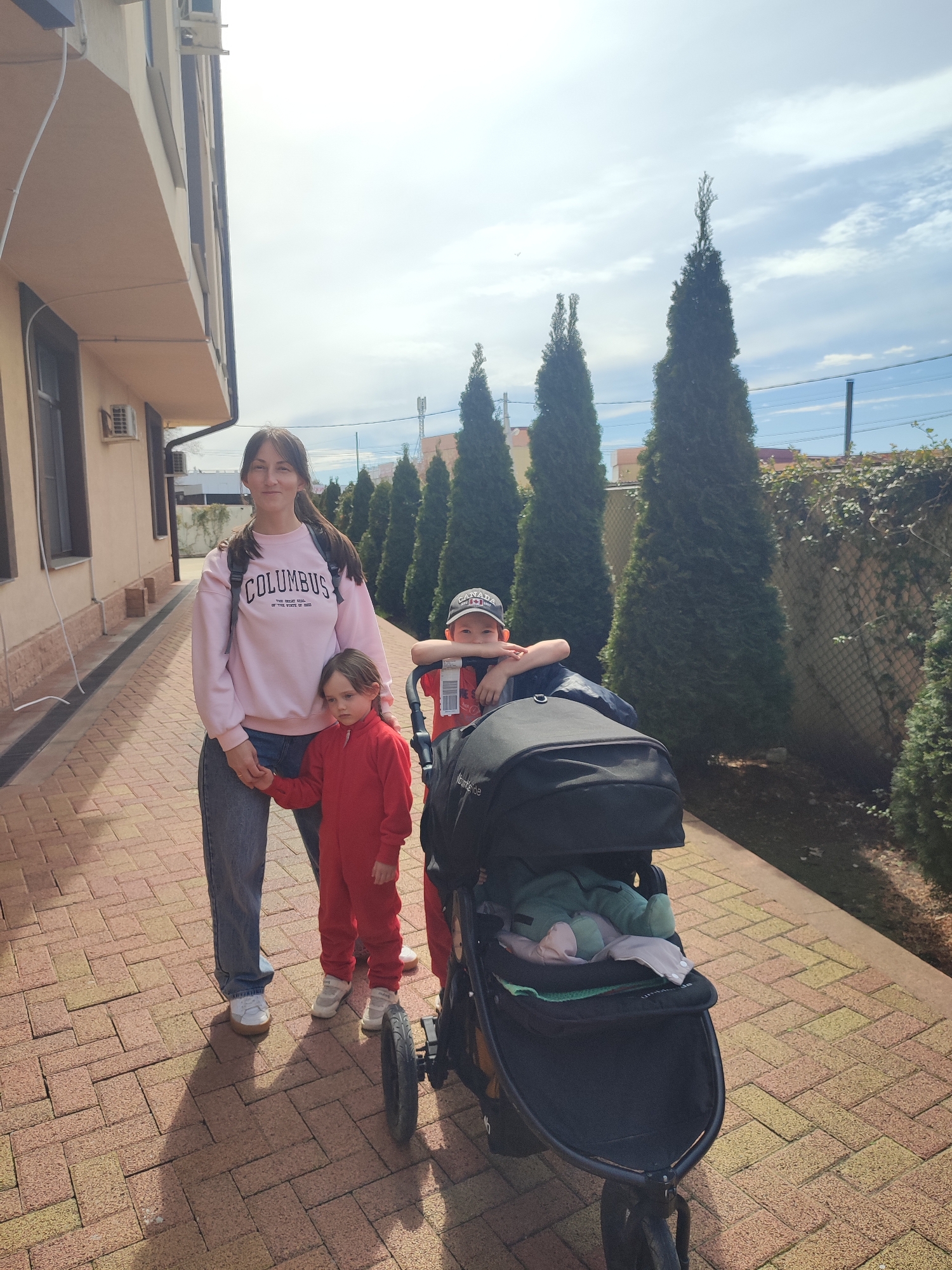 A woman, a young girl, and a boy stand on a brick-paved area beside a building. The woman, wearing a pink sweatshirt with "COLUMBUS" printed on it and blue jeans, is holding the hand of the young girl, who is wearing a red jumpsuit. The boy is leaning on a black stroller. Behind them are several tall, cone-shaped trees. A fence with green foliage is visible in the background. The building to the left is light-colored with dark-framed windows. The location is Sirius, Russia.