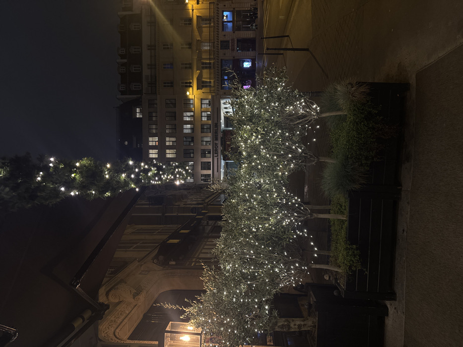 Night scene showcasing trees adorned with fairy lights in planter boxes bordering a dark street. A building with illuminated windows looms in the background, including signage for "LEROY MERLIN". Garland with lights stretches above a structure on the left. The overall ambiance is warm and festive.