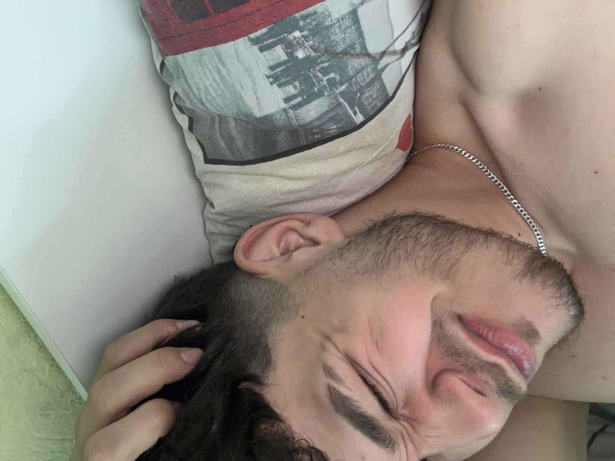 An overhead-angle image captures a young adult male, likely in a bedroom setting in Polenitsa, Bulgaria. The subject is positioned on his right side, facing towards the upper-left of the frame. He has dark, curly hair with a faded cut on the side, and a short beard covering his jawline and chin. His eyes are tightly closed, and his facial muscles are contracted, creating visible wrinkles around his eyes and nose, with his lips slightly pursed, indicative of discomfort or a strong physical reaction. A bare arm is visible in the lower portion of the frame, and a thin silver-colored curb chain necklace rests on his clavicle area. His left hand is positioned near his temple, with fingers resting on his hair. He is resting on a light-colored pillow with a patterned pillowcase featuring a grayscale graphic of buildings, possibly a cityscape, with a red element visible on the far right. The background consists of a plain light-colored wall or headboard in the upper-right, and a lighter green texture (possibly a blanket or curtain) in the upper-left.
