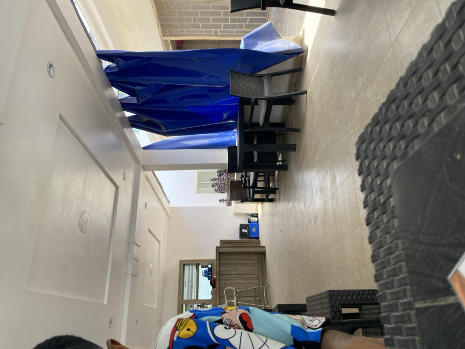 The image depicts a semi-outdoor dining or lounge area, likely a patio or veranda, located within a building complex in Jos, Nigeria. In the immediate foreground, the back of an individual wearing a blue and white shirt patterned with Doraemon cartoon characters is partially visible, seated at a dark, woven table or chair, partially obscured. The floor is covered with light-toned rectangular tiles. The area is furnished with multiple dark, woven plastic tables and chairs, arranged for seating. To the right, several vertical panels of blue tarpaulin or thick fabric are suspended, acting as partitions or sun shades. In the mid-ground, a wooden-textured bar counter with a single silver-colored high-stool is present. Near the base of the bar, two blue crates and one black crate are visible on the floor. Beyond the seating area and bar, an open-air space with white-painted walls and a glimpse of green and reddish foliage from plants is discernible. The ceiling above the patio area is white with recessed lighting fixtures and decorative rectangular panels. The scene is brightly lit by ambient daylight, indicating outdoor exposure. No specific signage or landmarks are visible within the image to identify the precise name or address of the establishment within Jos.