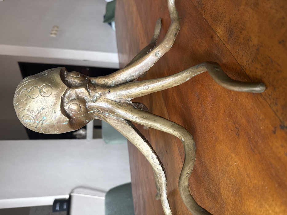 A patinated bronze-colored sculpture of an octopus, featuring an anthropomorphic head with recessed eye sockets, a distinct nasal ridge, and intricate etched patterns on its cranial surface, rests centrally on a polished, reddish-brown wooden table